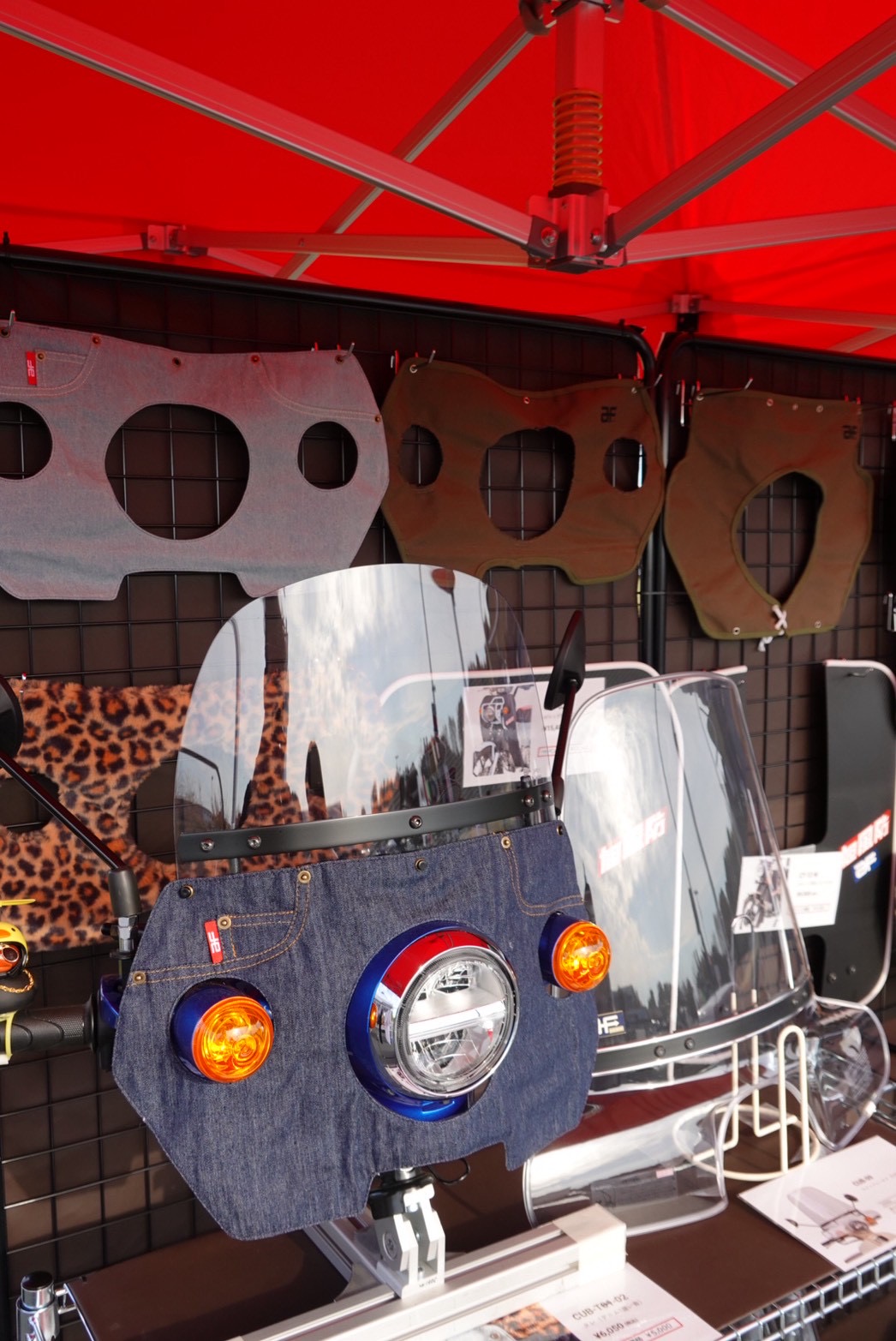 大人気のCT125ハンターカブのタレ付き風防や、グッズ系の販売が豊富なイベントとということもあって、オリジナルグッズも目立つ位置に配置しました。